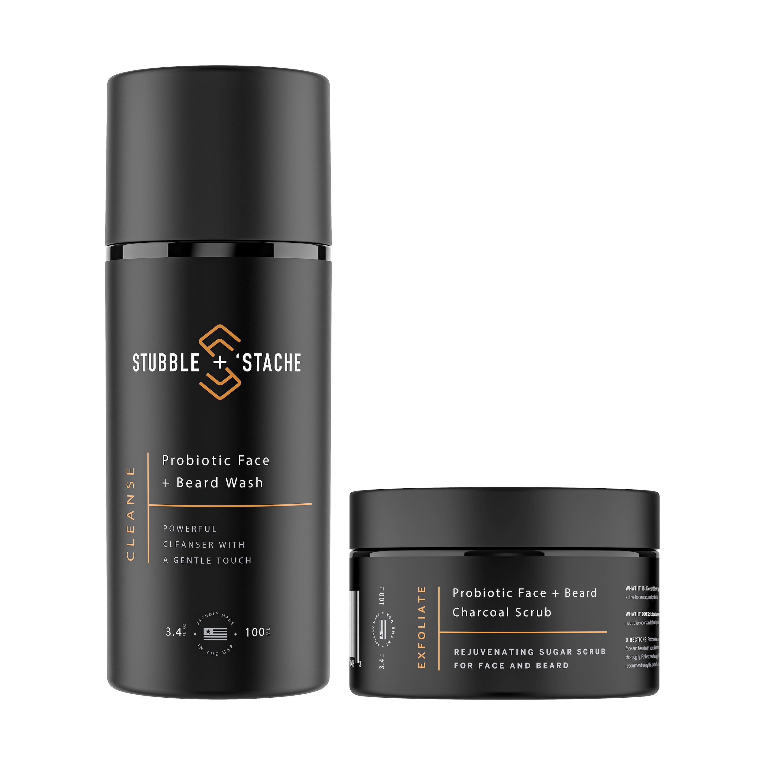 What it is: This kit provides everything you need to properly cleanse and exfoliate your skin and beard (if you have one) while supporting your acid mantle and microbiome. The Clean Up Crew contains one 3.4 fl oz bottle of Cleanse: Probiotic Face + Beard Wash and one 3.4 fl oz jar of Exfoliate: Probiotic Face + Beard Charcoal Sugar Scrub.