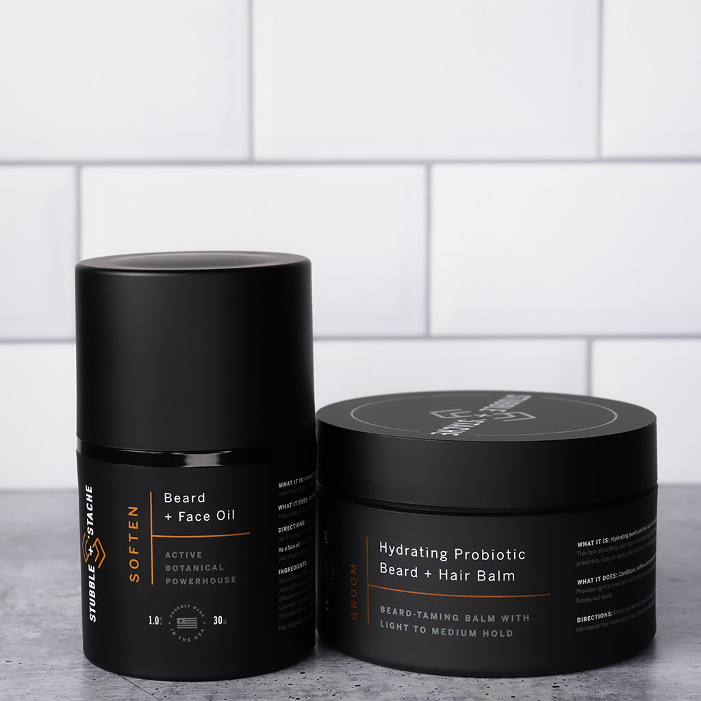 What it is: This kit includes a 1 fl oz bottle of award-winning Soften: Hydrating Face + Beard Oil and a 3.4 fl oz jar of Groom: Hydrating Probiotic Hair + Beard Balm.