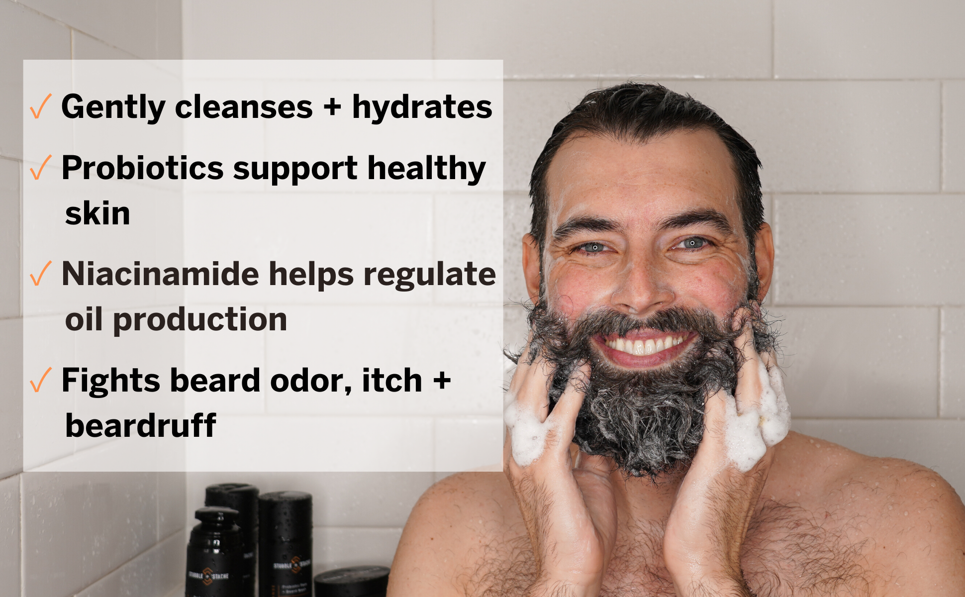 It’s a premium face wash first, that just happens to be optimized for stubble, mustaches, and full beards too.